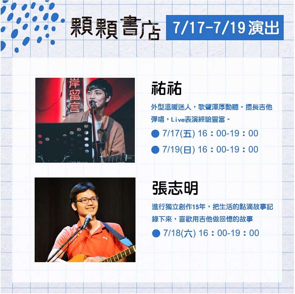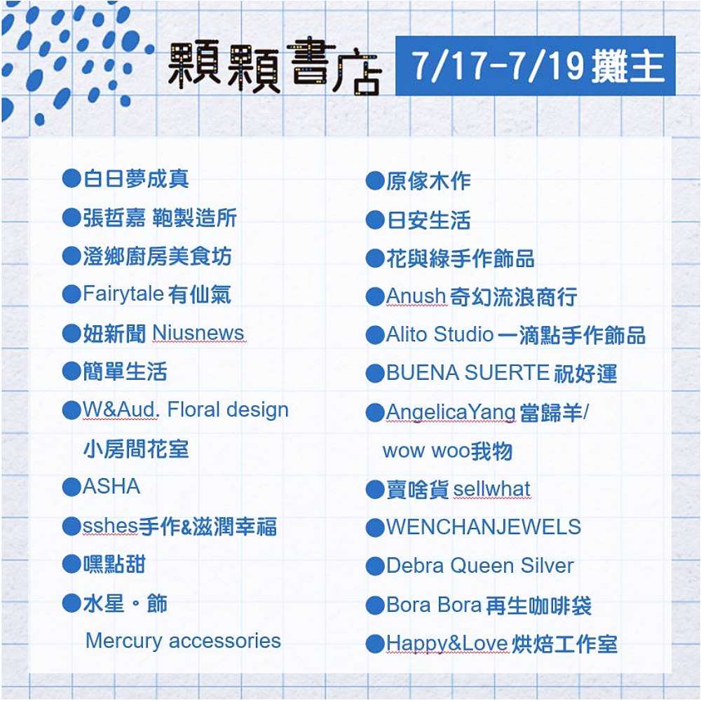 最後就附上本週末(7/17~7/19)參加的攤位給各位參考,顆顆書店表示也歡迎有興趣的人報名攤主,與大家一起共襄盛舉。由於每週末攤位與出演的街頭藝人不盡相同,建議妞妞們留意顆顆書店的粉專消息(點我前往),以便查看最新消息、當週進駐的文創品牌與街頭藝人。
