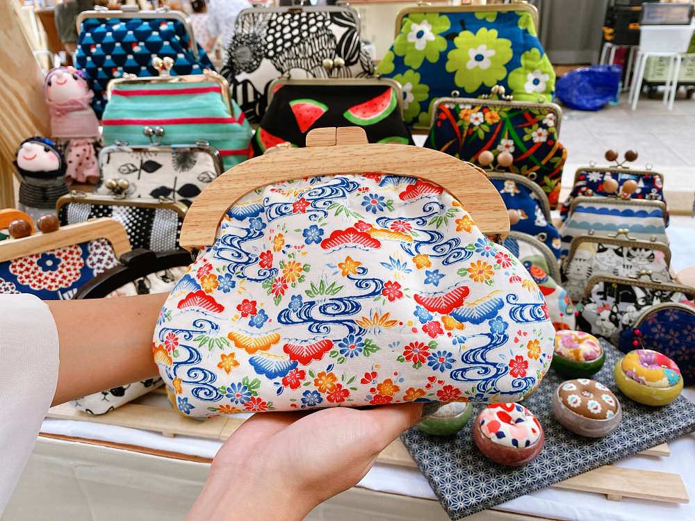 手作攤位還有以日本布製作的包包,每一款都相當獨特,且隨附掛鍊,當成手拿包或肩背包都很可以。