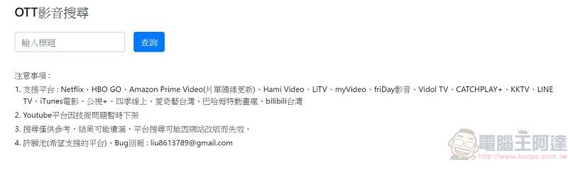 目前網頁說明有支援Netflix、HBO GO、Amazon Prime Video(片單隨緣更新)、Hami Video、LiTV、myVideo、friDay影音、Vidol TV、CATCHPLAY+、KKTV、LINE TV、iTunes電影、公視+、四季線上、愛奇藝台灣、巴哈姆特動畫瘋、bilibili台灣,而bilibili台灣 Netflix和bilbili因為網站機制特殊,他也表示搜尋結果可能不完全正確。