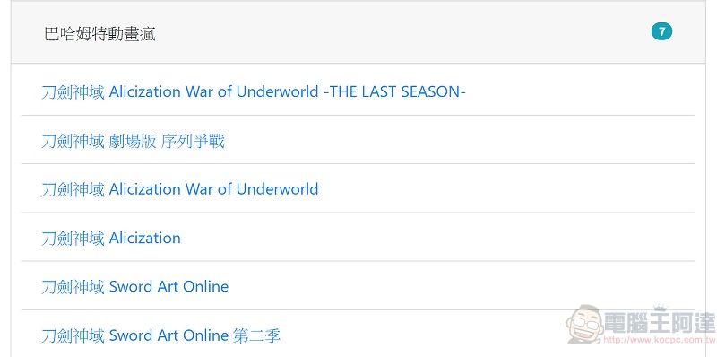 因此我們也實地測試「OTT影音搜尋」的搜尋效果如何,使用方式也很簡單,就是在搜尋框打片名,首先我們打出「刀劍神域」,接著跳出了13個平台與73筆搜尋結果,點開播放平台後會顯示有播映的作品名,像刀劍神域在巴哈姆特動畫瘋上,從最早的《刀劍神域 Alicization》到最新的《刀劍神域 Alicization War of Underworld -THE LAST SEASON-》都有: