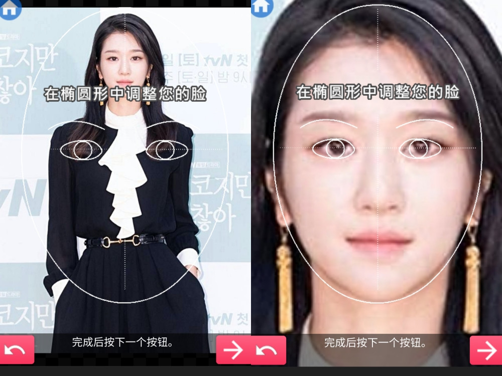 之後先以雙指放大及縮小,將照片先大致對準雙眼及臉型,完成後就可以按「向右」的箭頭以示完成。