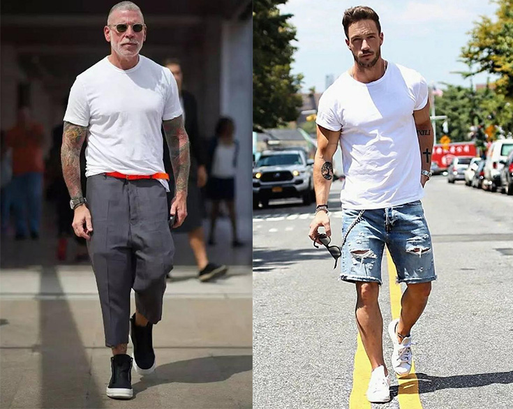 白素T之所以受歡迎的原因在於它光是單穿就很帥!極簡潔白風格給人一種俐落清新的形象,無論下身配卡其短褲、牛仔短褲或是球褲都很有型;搭長褲的話也能依照褲子長短、版型、高低腰來決定是否把白T紮進去,營造3:7身的長腿錯覺。