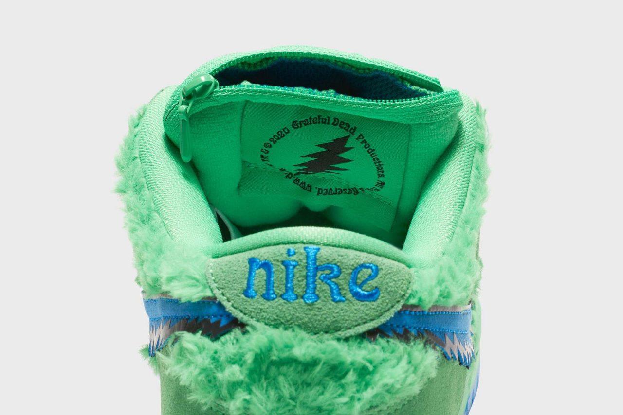 本次 Nike SB 找上經典樂團 Grateful Dead 合作,Grateful Dead 成立於 1960 年代,曲風多元包含了搖滾、民謠、雷鬼等。Nike SB Dunk Low Grateful Dead 採用了小熊以及絨毛元素,是汲取於樂團的 History of the Grateful Dead, Volume 1 (Bear’s Choice) 專輯封底,另外也加入了樂團標誌性的 Steal Your Face skull 圖樣,鞋款整體刻意帶了點舊化處理。