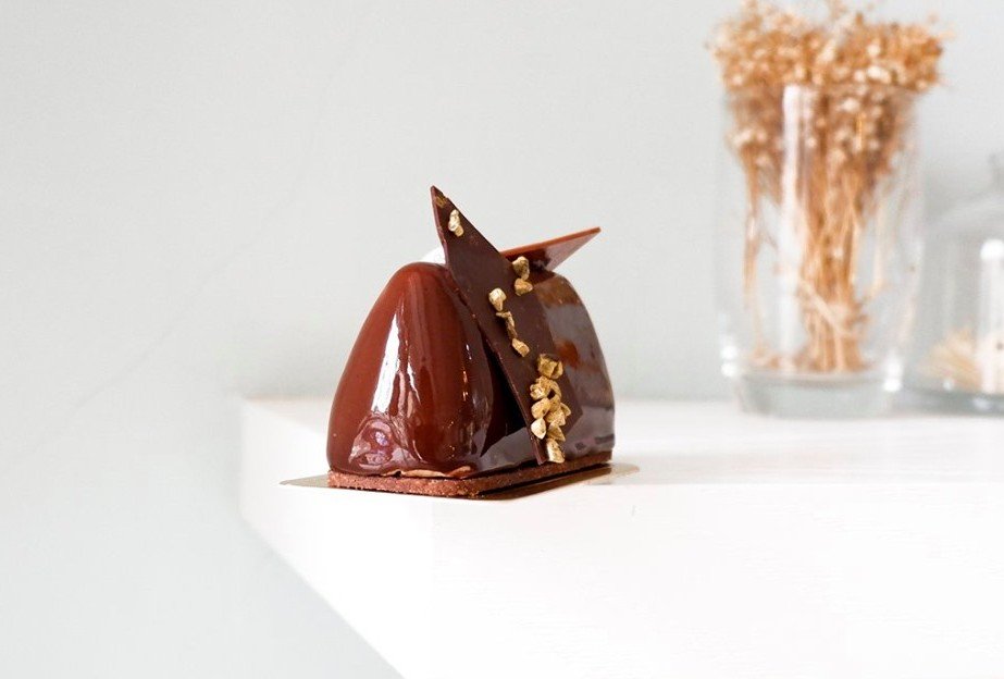 主廚將許多台灣日常當中熟悉的味道,融入在精緻繽紛的法式甜點裡,像是這款「豆油朱古力」以牛奶巧克力作為主體,但是裡頭竟然還交織著「醬油」的鹹甜及焦糖香氣,超神奇的滋味卻一點也不違和,巧克力與醬油兩位深黑色的味道完美融合於蛋糕中呀~