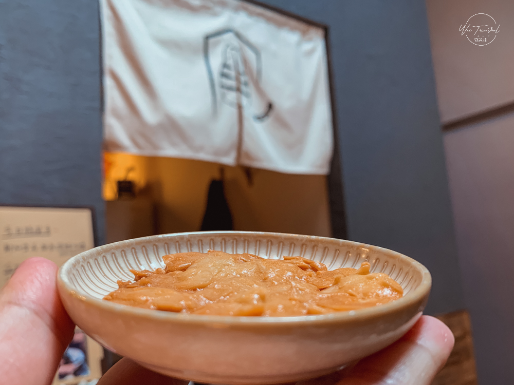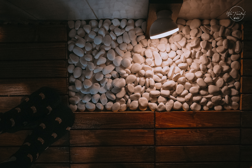 從山水門簾穿越後開啟一扇門是通往廁所(御手洗)廊道,小老闆運用戶外木頭磚與鵝卵石及另一盞走過即亮的感應燈,塑造出了日式枯山水的庭園空間,相當愜意。