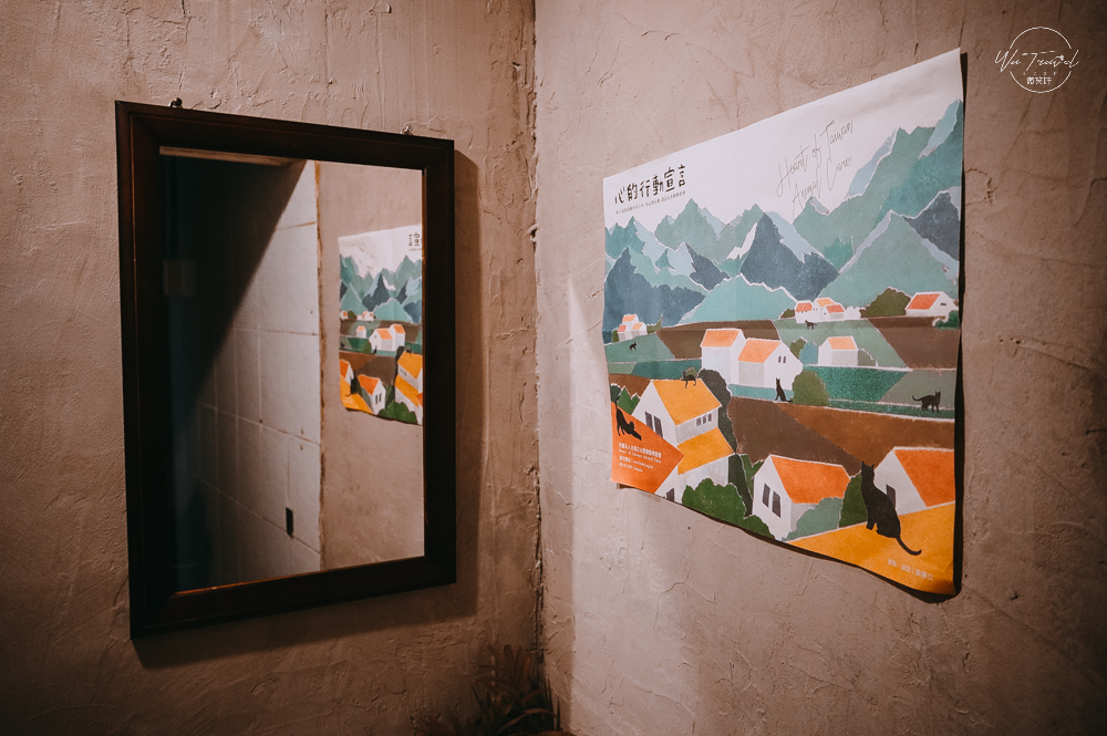 開啟了黑色大門,木質色地板望眼過去像山的門簾,小老闆熊貝說著:『那一幅印有霧氣繚繞,酷似都蘭的層層山嵐,希望藉此讓人在還未進入空間時,就能讓煩躁的心逐漸沉靜。』,這些微小的細微都透過他們的用心讓我驚嘆,這確實不只只是咖啡廳。