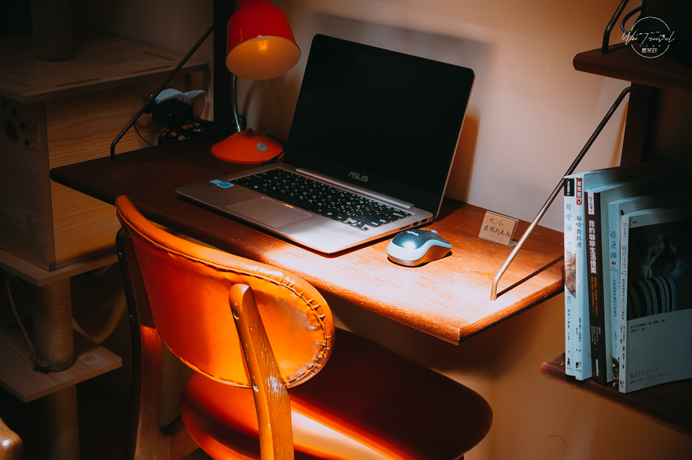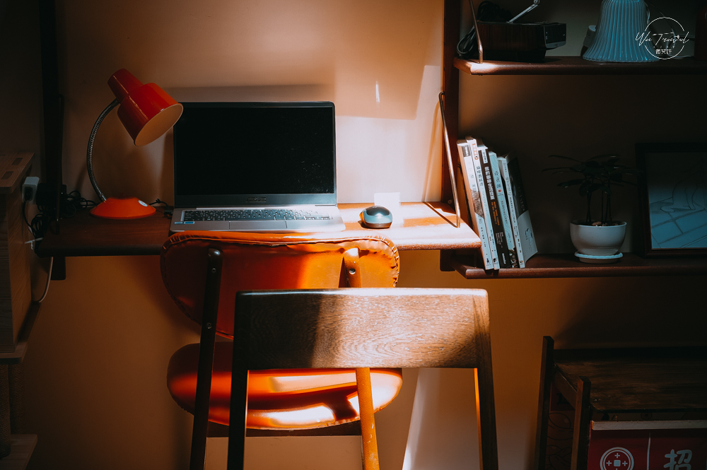 整牆的層板架書桌跟日式老件都是小微光的收藏品,陽光灑入照印在大小老闆的專屬座位。
