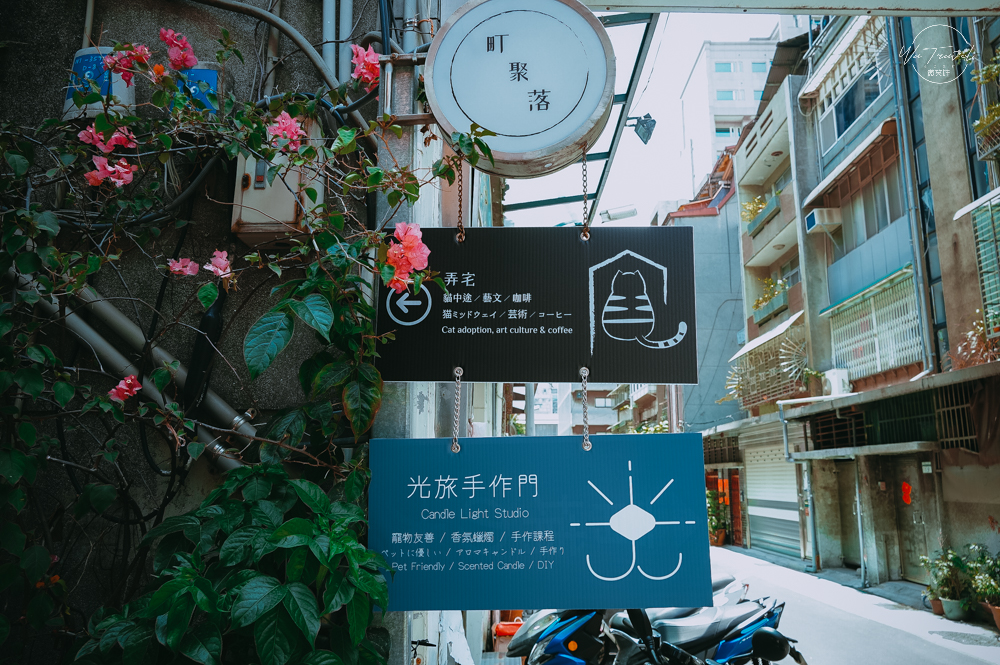 從松江南京捷運站八號出口出來走路約5分鐘就可以抵達弄宅咖啡廳,這裡門口其實不好找,加上我們去的前一天巷弄的地板上鋪上水洗石子,因此拉起了封鎖線,弄宅咖啡廳很像一個像弄內的小聚落,在門口的地方有掛上小小可愛的招牌「町聚落」裡面除了弄宅老屋咖啡廳之外還有光旅手作們一起,未來可能會結合一起做蠟燭搭配咖啡、飲品等等。