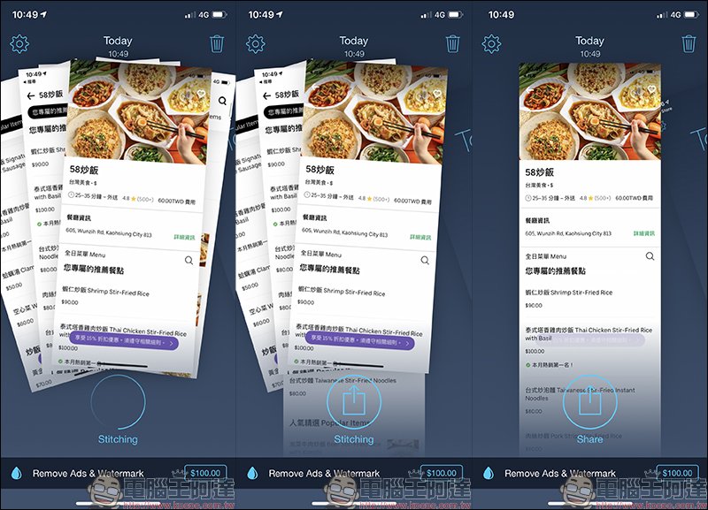 以 UberEats 的餐廳頁面截圖為例,先完成多張截圖後開啟 Tailor 進行圖片合併,等待幾秒時間就能完成長截圖合併,接著就可以點選分享將其傳送至其他應用程式或儲存在相簿內: