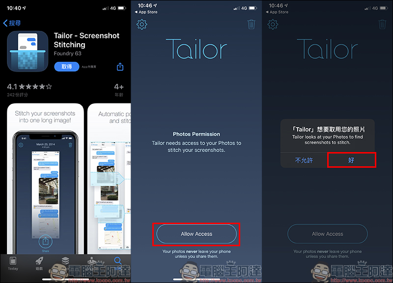 首次開啟 Tailor App 必須先點選 Allow Access 允許照片取用權限: