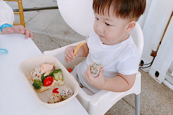 口味偏清淡,沒有過多調味、只有食物的原始甜味,像飯糰、壽司都非常的清爽,形狀也容易入口,一口一個,讓迫不及待想玩的小朋友可以一口放入嘴巴再衝去玩。餐盒中也有滿滿的綠色蔬菜,營養均衡。