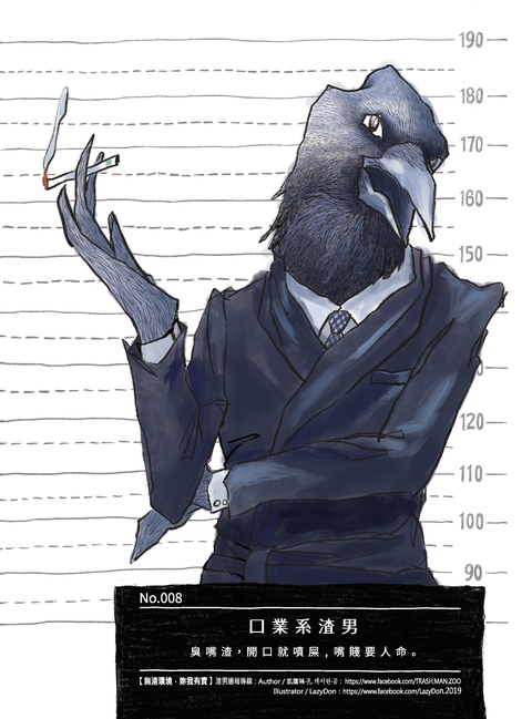 「臭嘴渣 ‧ 烏鴉先生」,一開口就造口業,讓聽者瞬間烏雲罩頂。他們一點都不明白「沈默是金」的道理。他們的賤嘴到底是出於有意還是無心,其實不可考。當衝突引爆時,他們會狡辯那只是情趣或玩笑,但是他們所認定的無傷大雅,其實都是別人的心裡最痛。