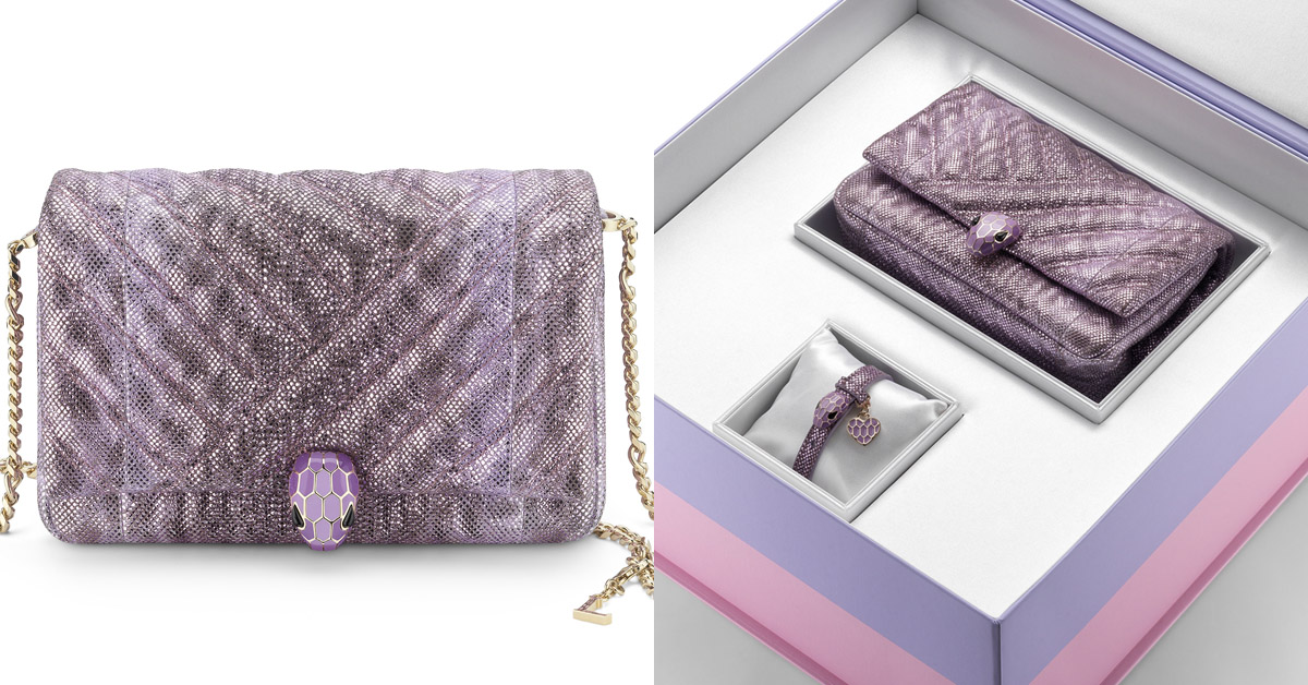 薰衣草色金屬水蛇皮「Serpenti Cabochon」迷你包+水蛇皮琺瑯手環套組。