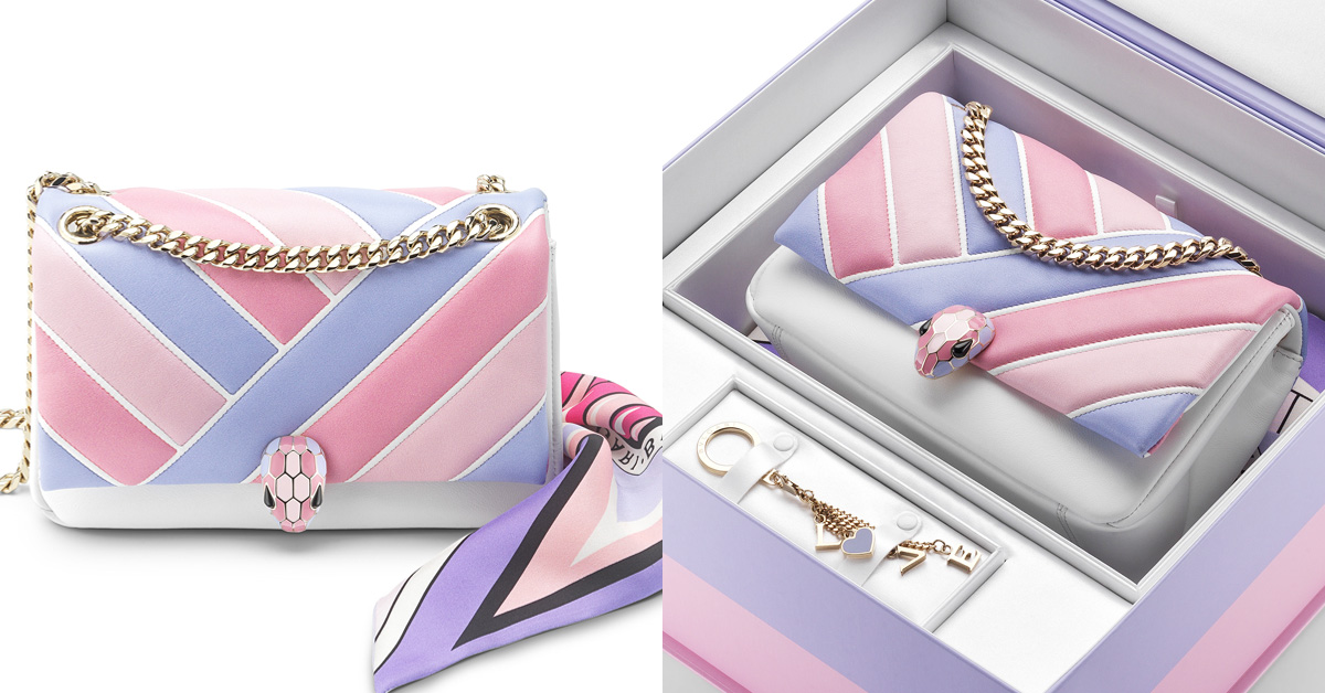 粉色條紋小牛皮「Serpenti Cabochon」肩揹包+印花絲巾及鑰匙圈吊墜套組。