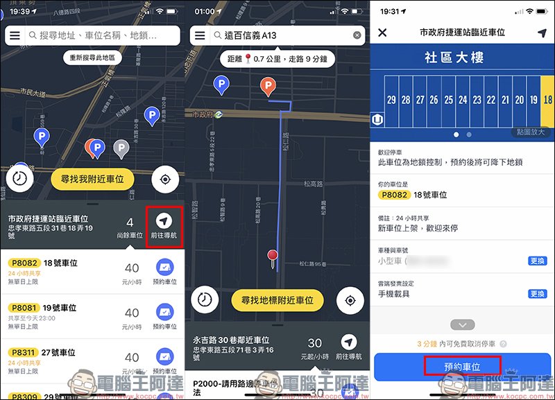 如果不知道如何前往, USPACE 也支援貼心的導航功能。若確定要使用該車位,為了避免前往路途中被他人搶走,只要先按下「預約車位」即可將該車位先預約下來,在 3 分鐘內也可隨時免費取消: