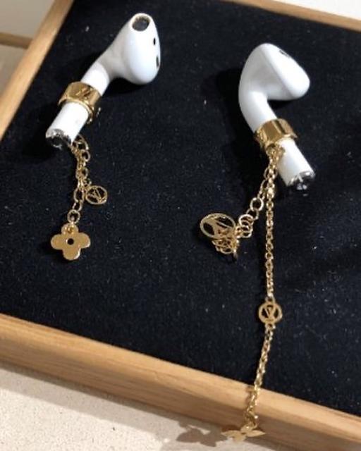 根據知名IG爆料帳號@Supreme_leaks_news所PO出的圖片,Apple劃時代的耳機產品AirPods被套上了一個如同「耳環」的配件,上頭刻有LV經典Logo及Monogram圖樣,甚至有像耳墜一樣的東西垂墜下來,並以鍊子連接裝飾物,遠看像極了一副金色的耳環,只不過是套在耳機上。