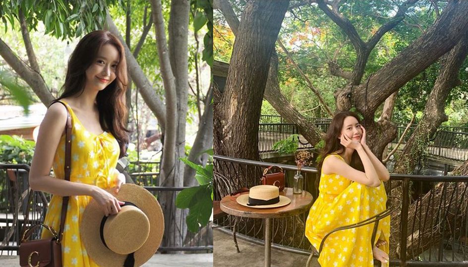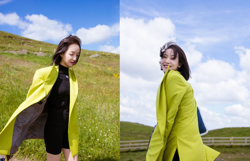 潤娥之前出遊選了一套亮黃色的小洋裝,配上草帽。這套洋裝乍看之下很顯眼,但因為潤娥的背景都是樹木,黃色給人的衝擊感反而被分散掉了,配上她溫柔的微笑,整個人看上去就是一個明亮的少女!