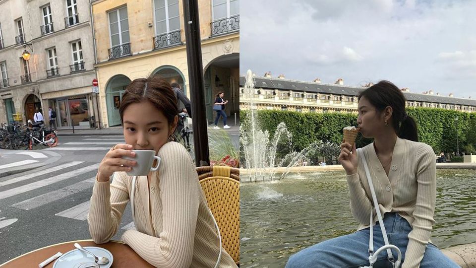 另一套則是米色薄上衣搭淺藍色牛仔褲,照片裡,Jennie的米色上衣跟巴黎的淡黃色牆壁很相襯,從照片裡,好像能感覺到巴黎暖洋洋的午後時光呢!