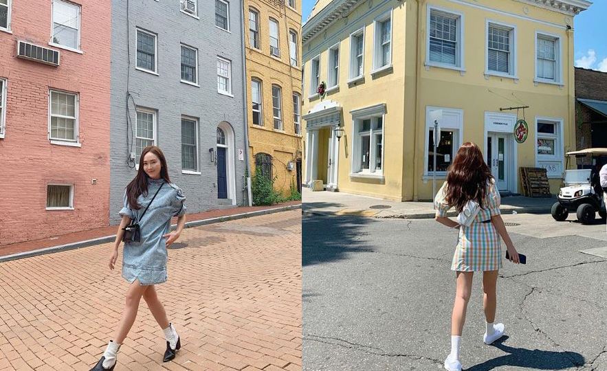 潔西卡之前在美國度假的時候,也選擇了淺色碎花洋裝,這一套很修身,還能小露大腿。鞋子則是簡單一雙黑色布鞋,就算要逛上一整天,相信也不會腳痛。
