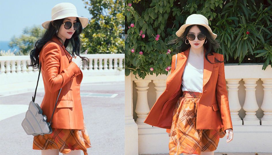 劉亦菲在摩納哥拍攝的這組寫真穿的都是橘黃色系的,和夏天暖暖的陽光很配呢!照片裡,劉亦菲穿著橘色西裝,搭配同色系的格子裙。