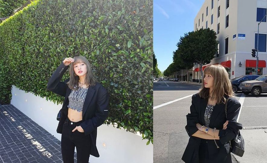 Lisa之前到加州渡假時,選了黑西裝作為外搭。唯唯敞開的西裝裡,是露臍的短上衣。不得不說,Lisa不愧是有著「芭比娃娃」之稱的超級美人,纖細的腰身完全把這一套衣服的優點展現出來了。