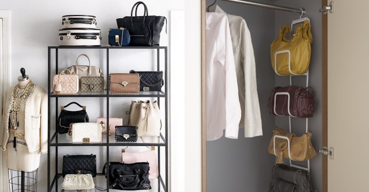 對側肩包來說,直立空間是最理想的地方,建議掛在掛鉤上,千萬不要亂折亂凹!而如果你的衣櫃空間很小,或是不想全都掛起來,把包包放在架上也可以。