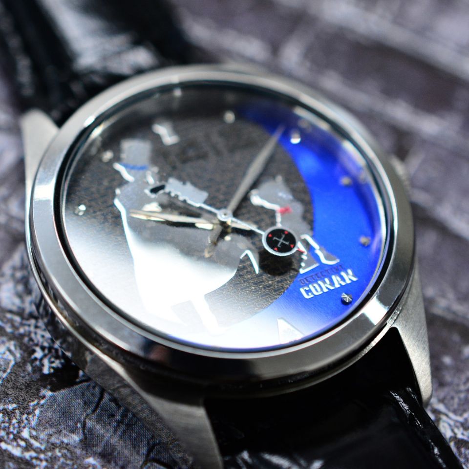 「追蹤者」是第一次推出的官方手錶,使用柯南和怪盜基德的剪影搭配貝克街的藍色月光,而且擁有柯南的麻醉錶也是許多人童年的夢想,這次「追蹤者」的設計團隊就將麻醉錶的準心及怪盜基德的撲克牌槍設計成秒針,將兩人分秒針鋒相對的情況活靈活現地演繹出來,是非常細膩的設計啊~