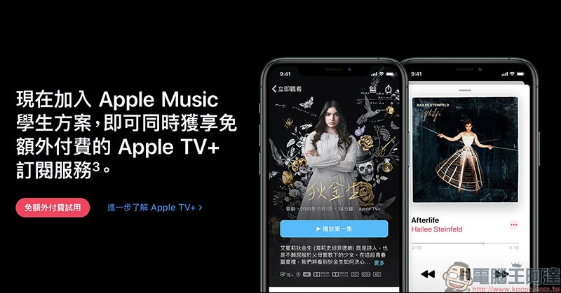 如果各位還是就讀大專院校的學生、平時也喜歡聽音樂,除了原本就可以用學生方案以每月 70 元訂閱 Apple Music ,近期 Apple Music 也推出限時免費試用活動,只要前往 Apple Music 官網去註冊,在驗證學生身份之後即可免費試用 6 個月 Apple Music ,同時還額外享有這段期間 Apple TV+ 免費看,若試用期過後想續訂再自行續訂。