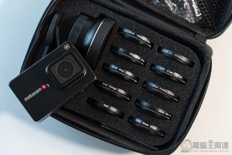 好啦!終於輪到實機開箱了!雖然相機本體就已經配件給好給滿(雙電池、藍牙遙控器又有 3.5mm 麥克風轉接頭超讚!),但這次我們入手的可以說是 Mokacam 的集資解鎖大全套版本。所以還有下圖這些超值配件包,內含包括鋁合金自拍桿套組與 37mm 12 件鏡頭組 -- 你沒聽錯,真的有 12 個鏡頭濾鏡可以把創意玩到極限。