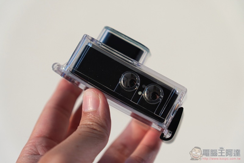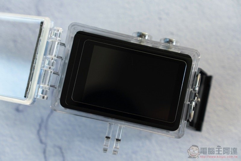 原廠直接將相機本體放在 60m 的防水殼內,在這樣的狀態下可以支援一般運動相機的腳架接頭: