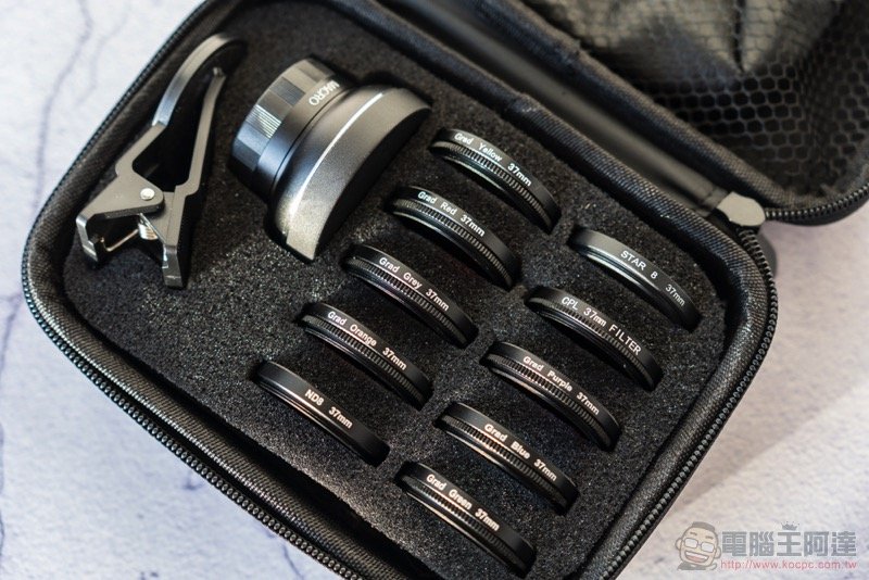 開箱的壓軸應該也是大家最期待的鏡頭 12 件鏡頭套組吧?Mokacam 還貼心附贈了鏡頭皮套: