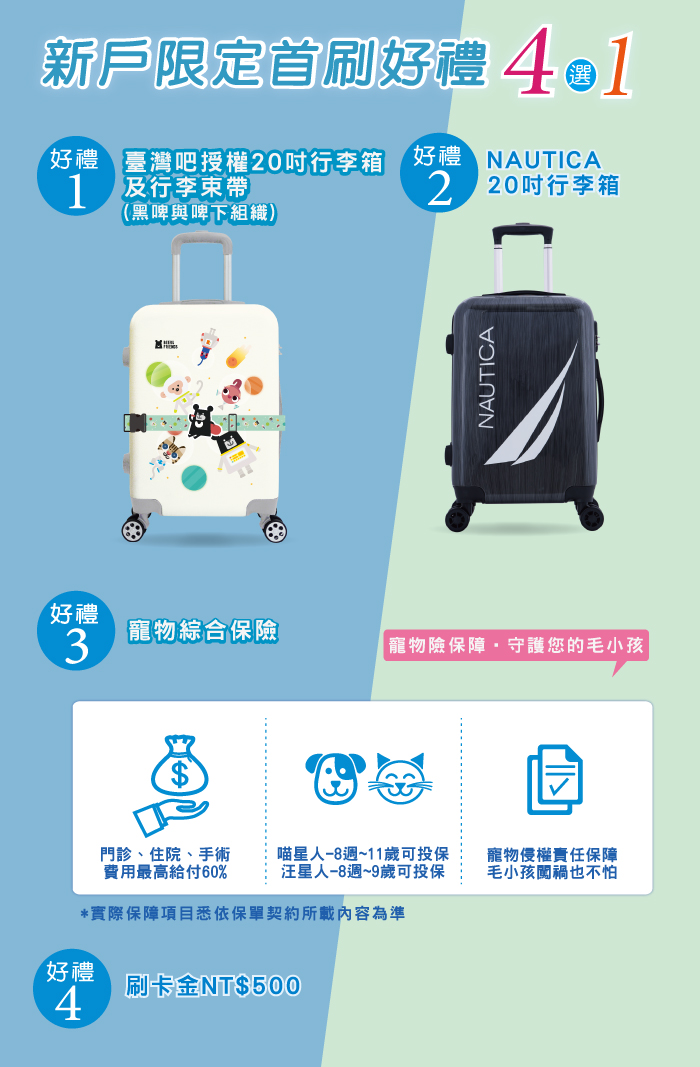 2020/12/31前,新戶申辦兆豐e秒Happy卡,核卡後30日內新增一般消費累積達NT$3,000(含)以上,可享「臺灣吧授權20吋行李箱及行李束帶(黑啤與啤下組織)」1只等好禮4選1。