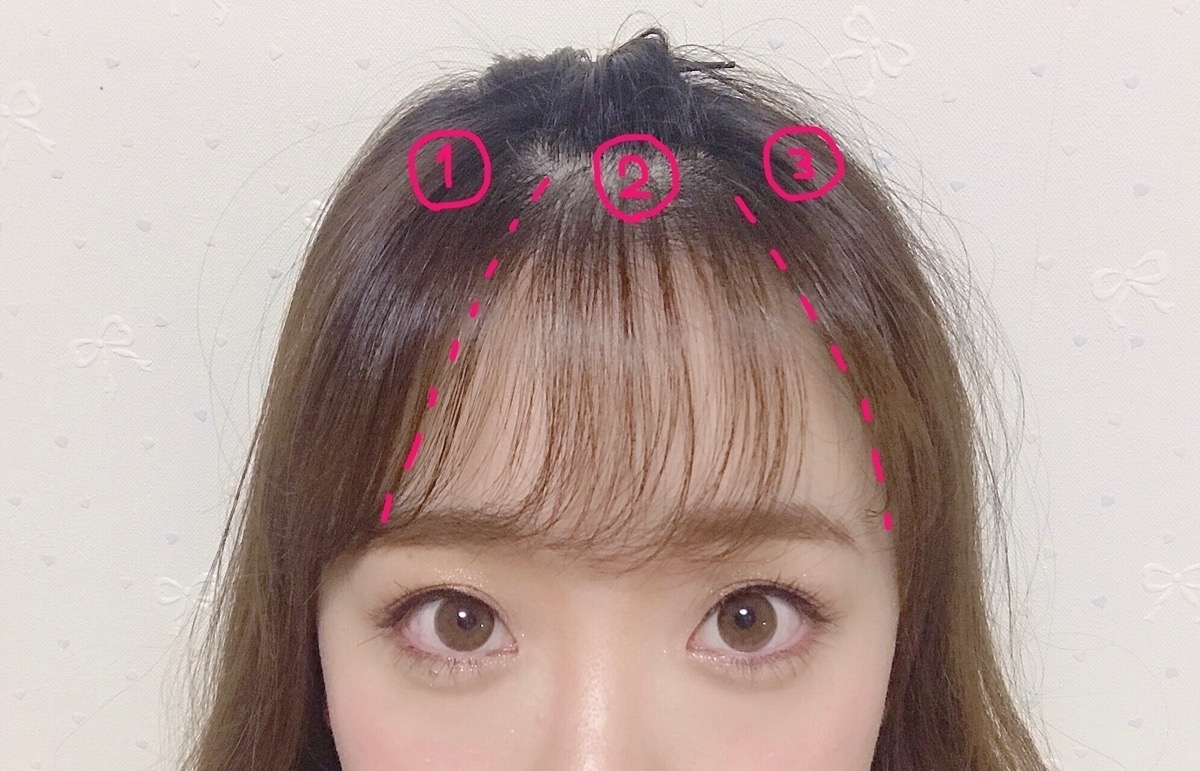 很多人在打造「偽空氣瀏海」時,會直接減少整片瀏海的髮量,不過如果想讓空氣瀏海更加自然可愛,我建議保留兩側髮絲(下圖①、③),只減少中央3分之1瀏海的髮量!