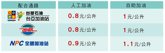 活動期間內,持新光銀行信用卡至指定加油站加油,享汽油每公升降價優惠。