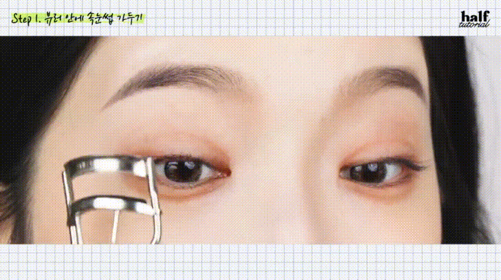 夾睫毛時跟刷睫毛不一樣、可以將下巴抬起往上看,一樣將鏡子由下往上照,可以清楚看到每一根睫毛!先用睫毛夾稍微推一下眼皮處、沿著根部將睫毛夾起來,再慢慢收放收放、慢慢往上帶,小心不要一次用力過度變成90度的直角睫毛。