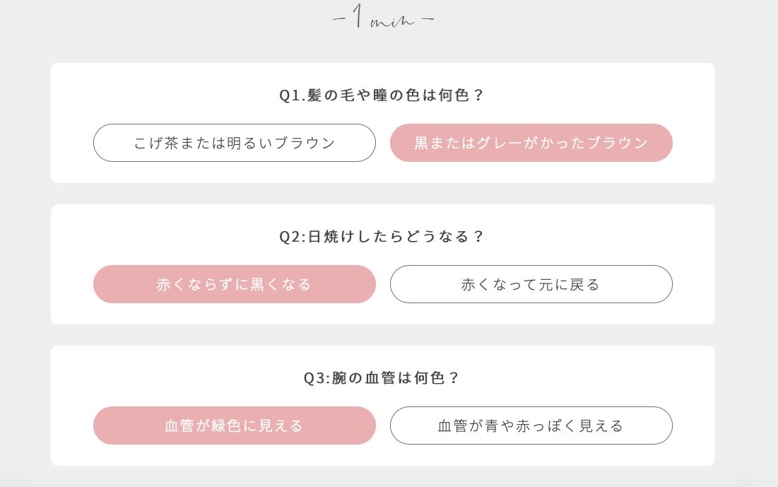 進入網站後點擊「1分鐘診斷」(1分でわかる色診断)即可進行測驗,一共有三道題目: