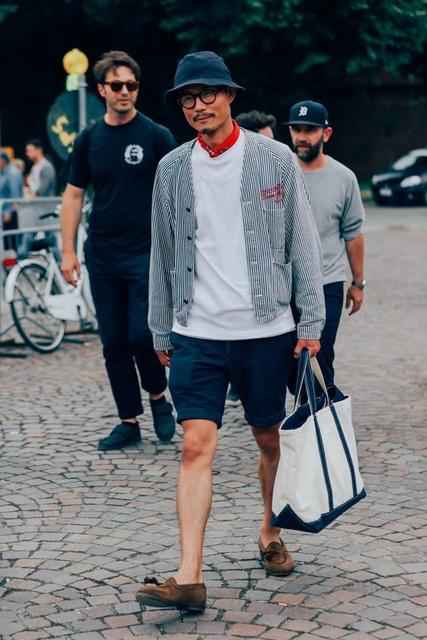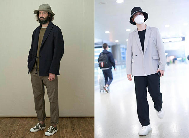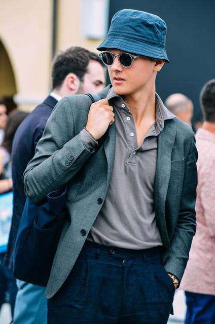 輕便的休閒西裝配上漁夫帽,是時尚週場邊常看到的穿搭,因為融合了正式與休閒,所以不會讓人覺得太過拘謹或太過隨便,呈現一種恰到好處的時尚感。西裝外套內裡可以搭配簡單的T恤、腳上穿球鞋;或是穿著襯衫搭九分西裝褲,都能與頭上的漁夫帽完美呼應。