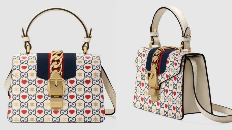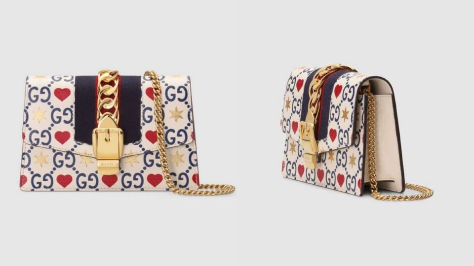 以經典藍紅色Sylvie織帶與心形、星星及GG圖案交替的設計,配上金色金屬鏈帶,設計超有巧思,紅色愛心與金色六芒心,如同炙熱閃耀的愛情!精緻華美的Gucci配上象徵愛情的圖騰,是不是超浪漫?