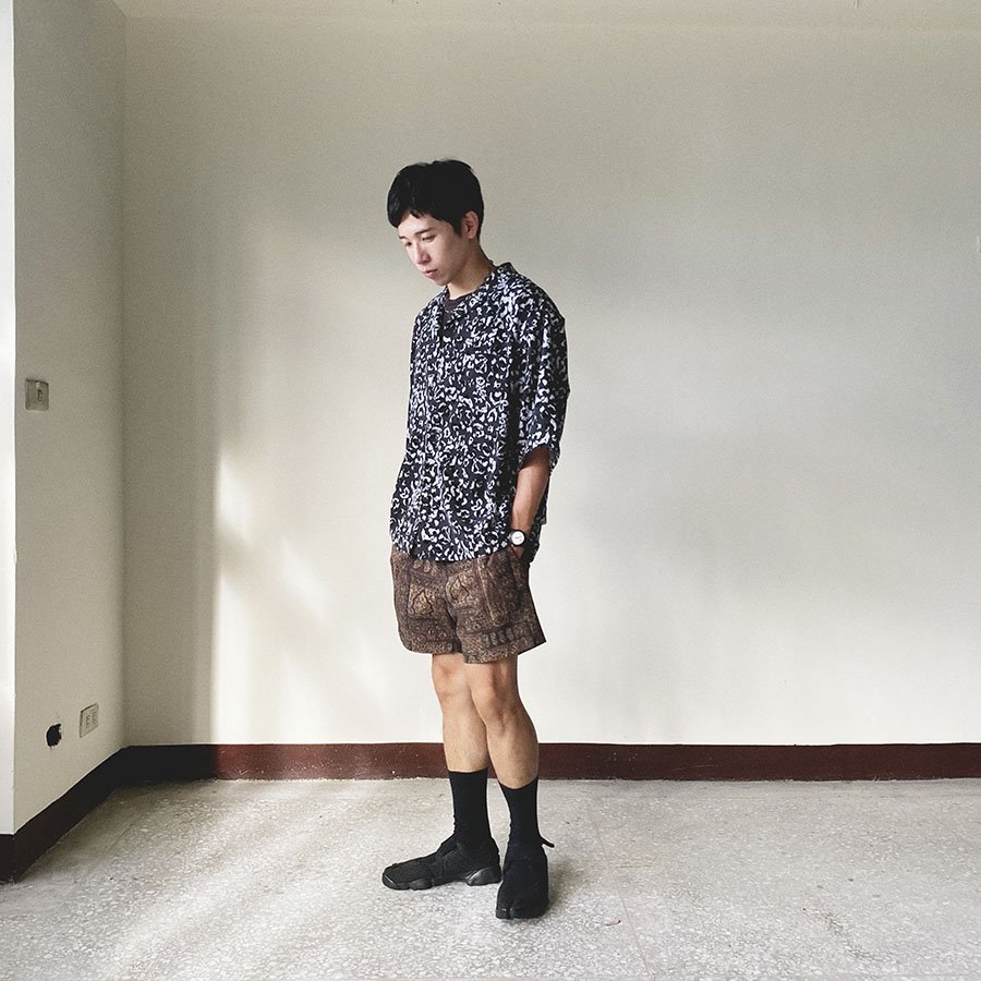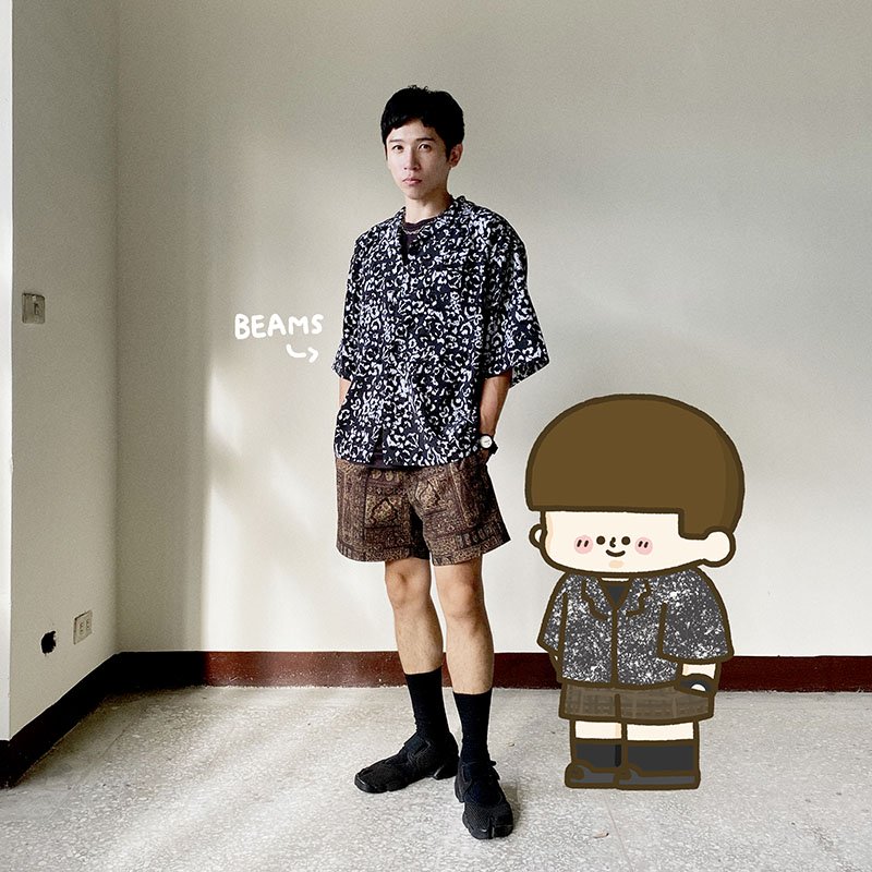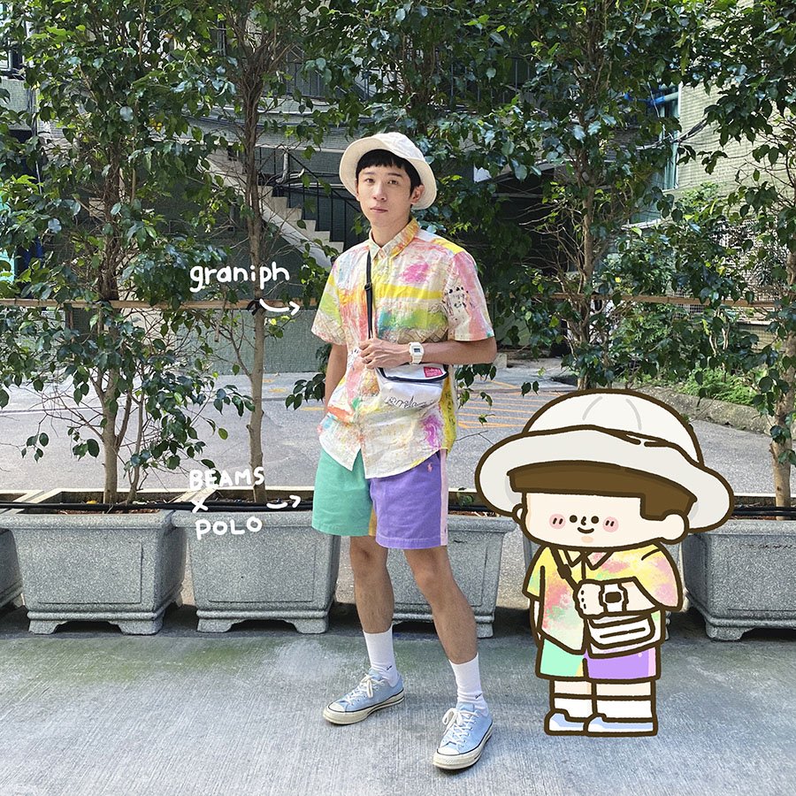 沒辦法去夏威夷就只好穿夏威夷衫過過乾癮吧~開領的襯衫內襯簡單的白TEE,配件隨行小包及帽子也用同樣是白色系的單品,下半身搭配和襯衫跳色的綠色運動褲,運用異材質的搭配,讓整體穿搭讓看起來更豐富且有層次感。