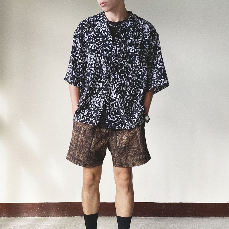 如果想要一點奢華感,就來一點動物紋吧!豹紋襯衫搭配變形蟲短褲,用兩件都是複雜花紋的單品,混搭出一種自己的風格。或許有人會擔心複雜的花紋會造成視覺上過於凌亂的問題,但因為全身都是深色系,即使花紋複雜,透過顏色也能找到一個平衡。