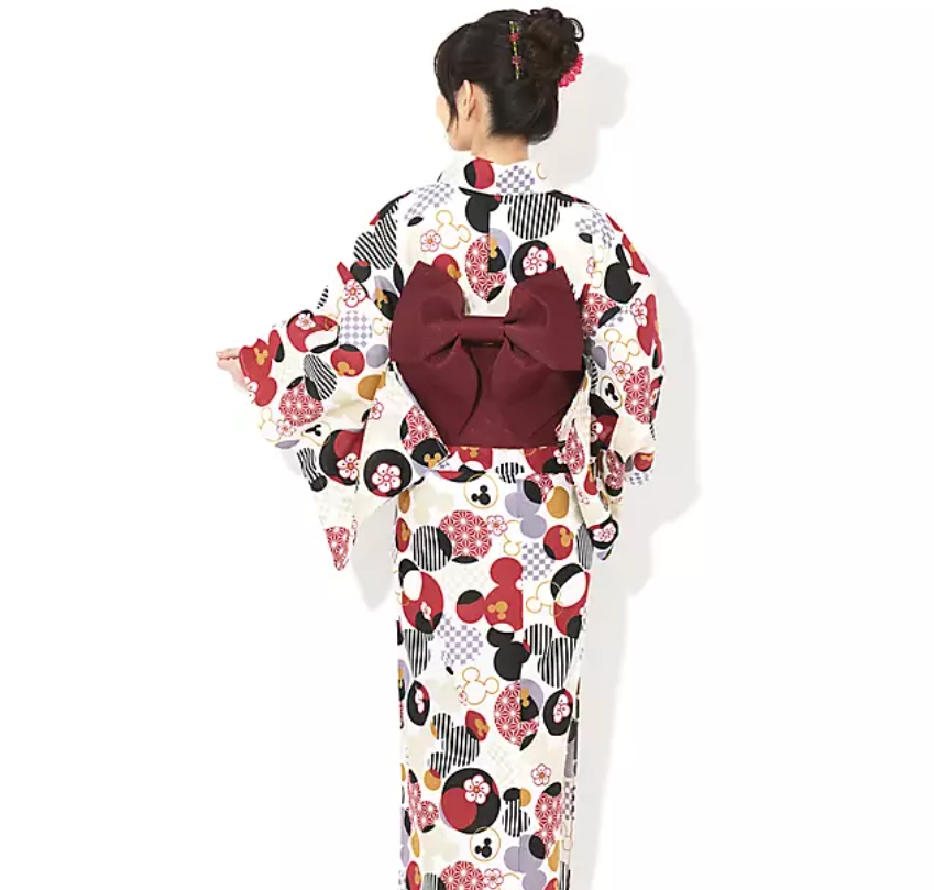 以白色為主色、印上許多紅黑圈圈的米奇浴衣,仔細看有發現米奇藏在其中嗎?腰帶和蝴蝶結以暗紅色設計,米奇浴衣看似可愛卻不失成熟感。