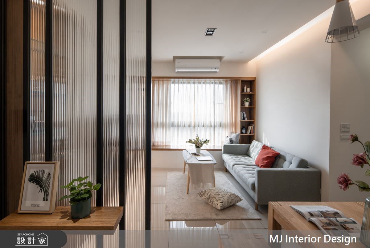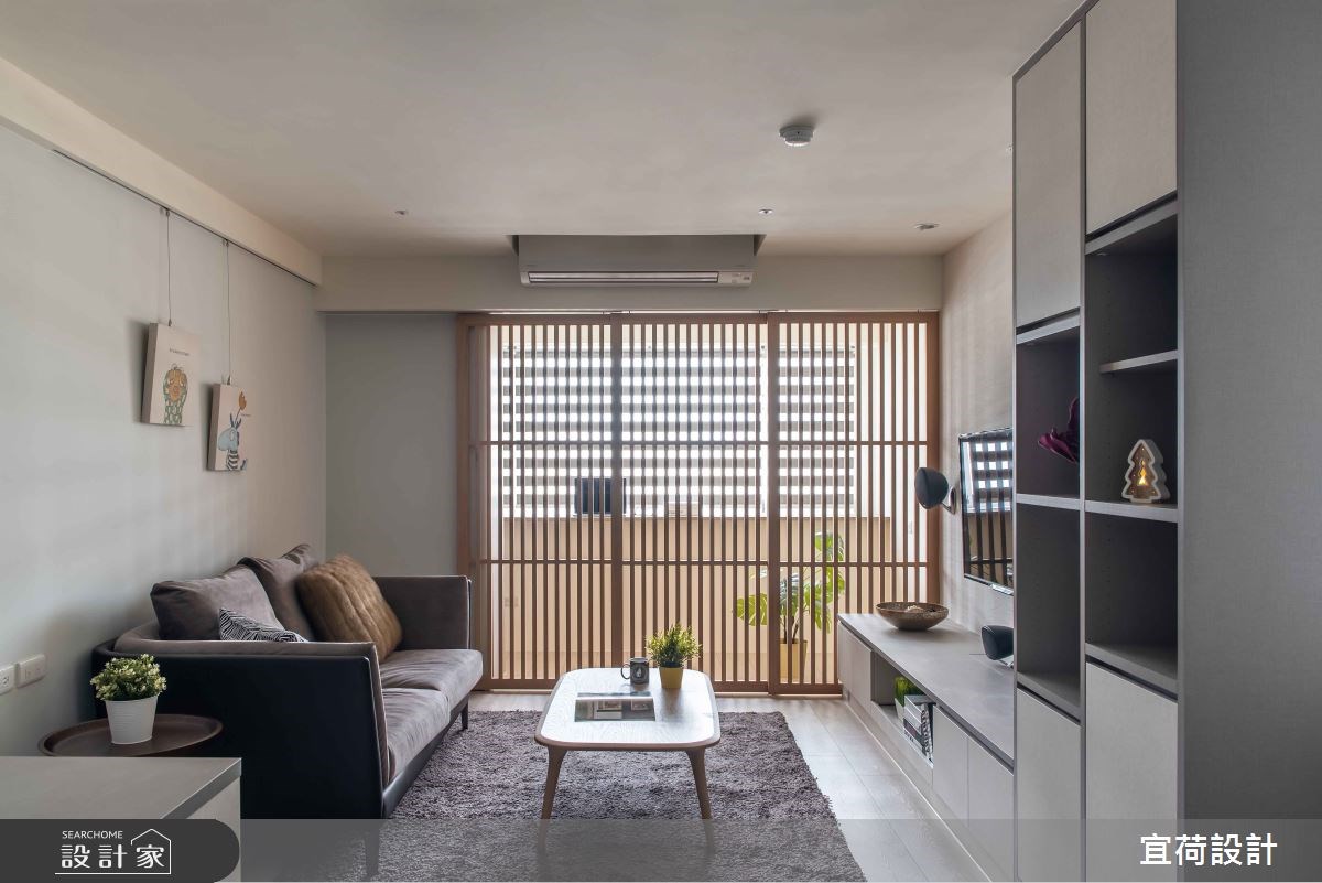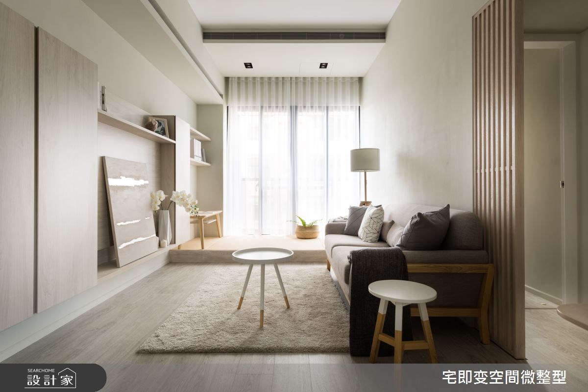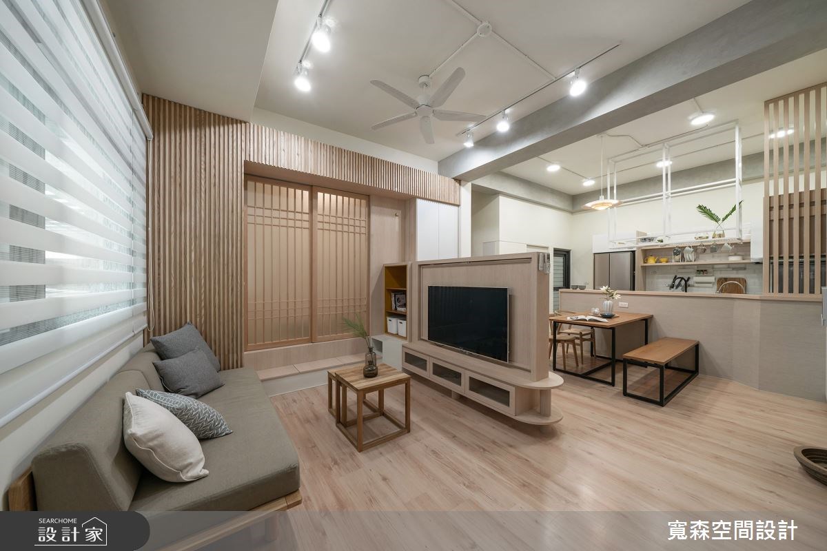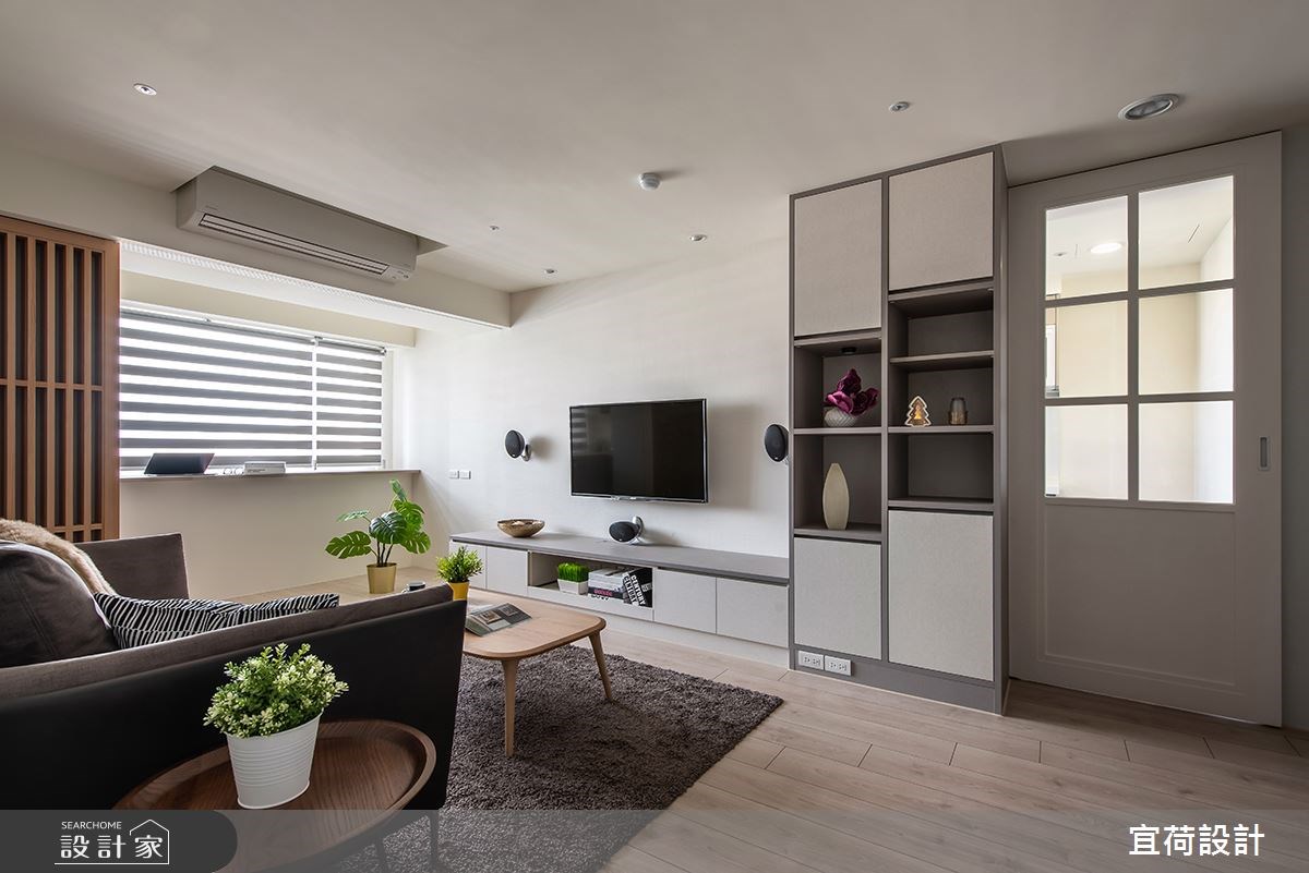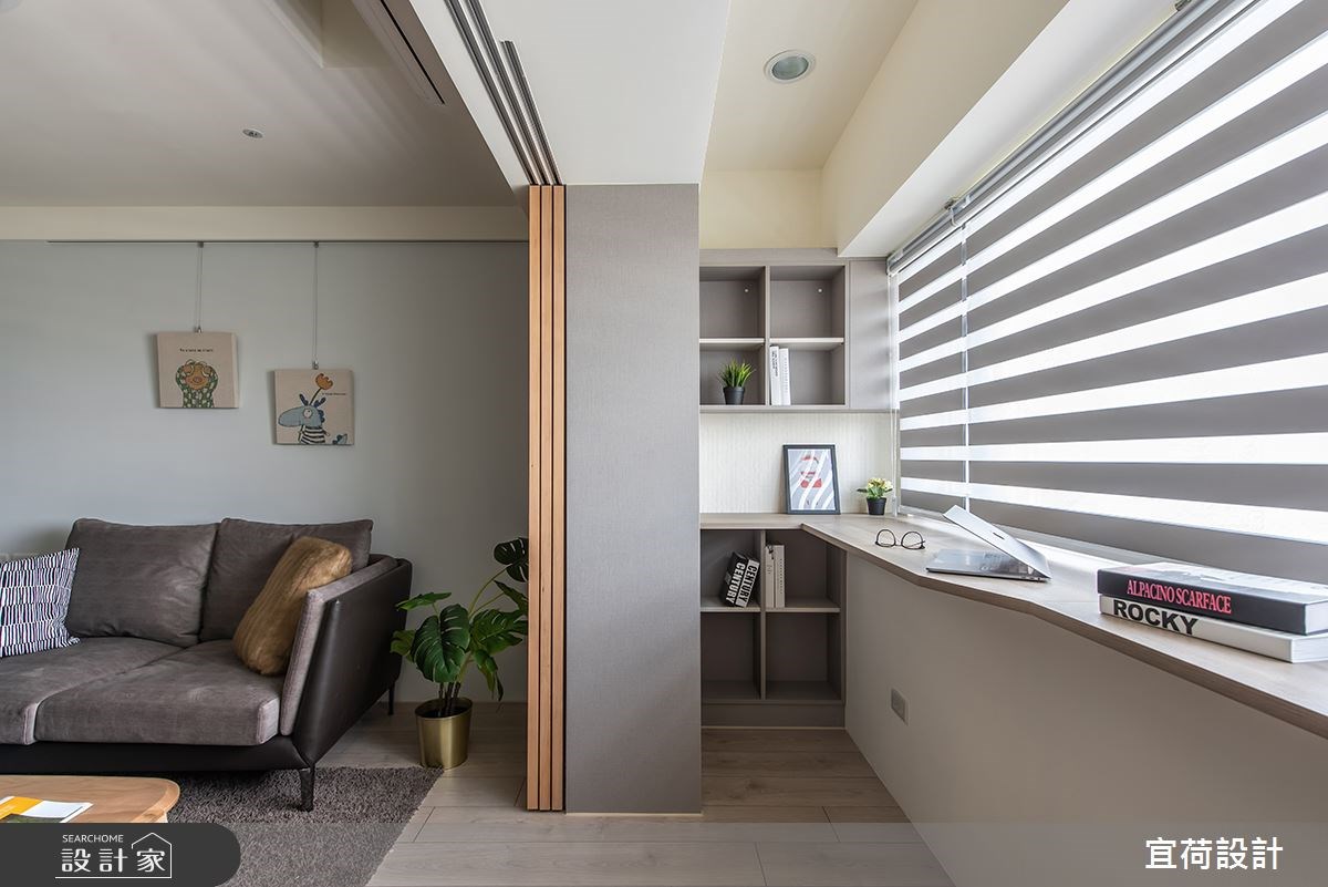 因為家中即將迎接新生兒的到來,所以 18 坪無印風小宅產生了老屋翻新、格局重整的需求。設計師在客廳旁依循大樑,用格柵拉門將空間一分為二,切割出獨立的工作區塊,而窗邊吧台刻意向外延伸,給予足夠的辦公檯面,並與開放式收納櫃接壤,讓畸零空間轉變為高機能的全新場域。
