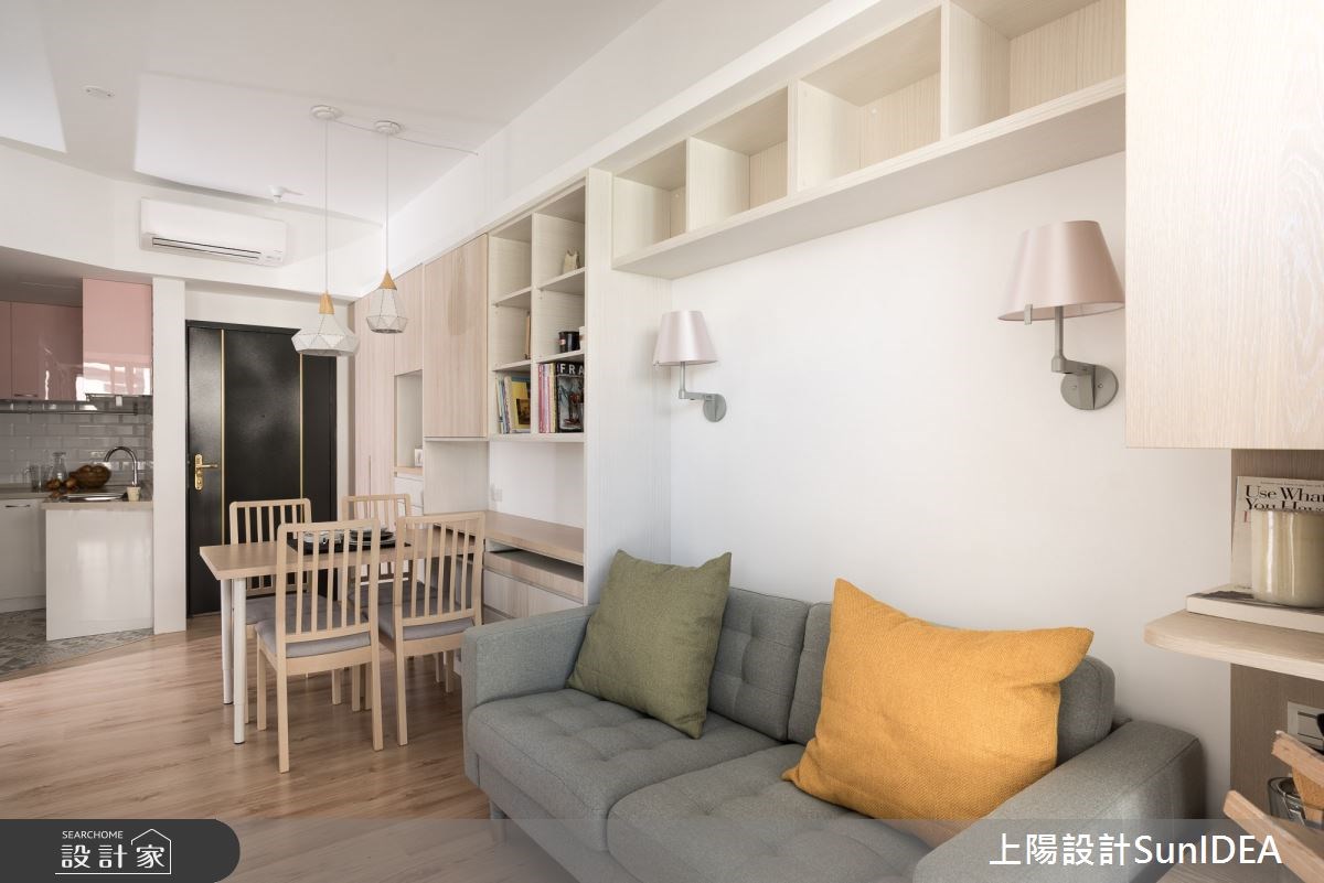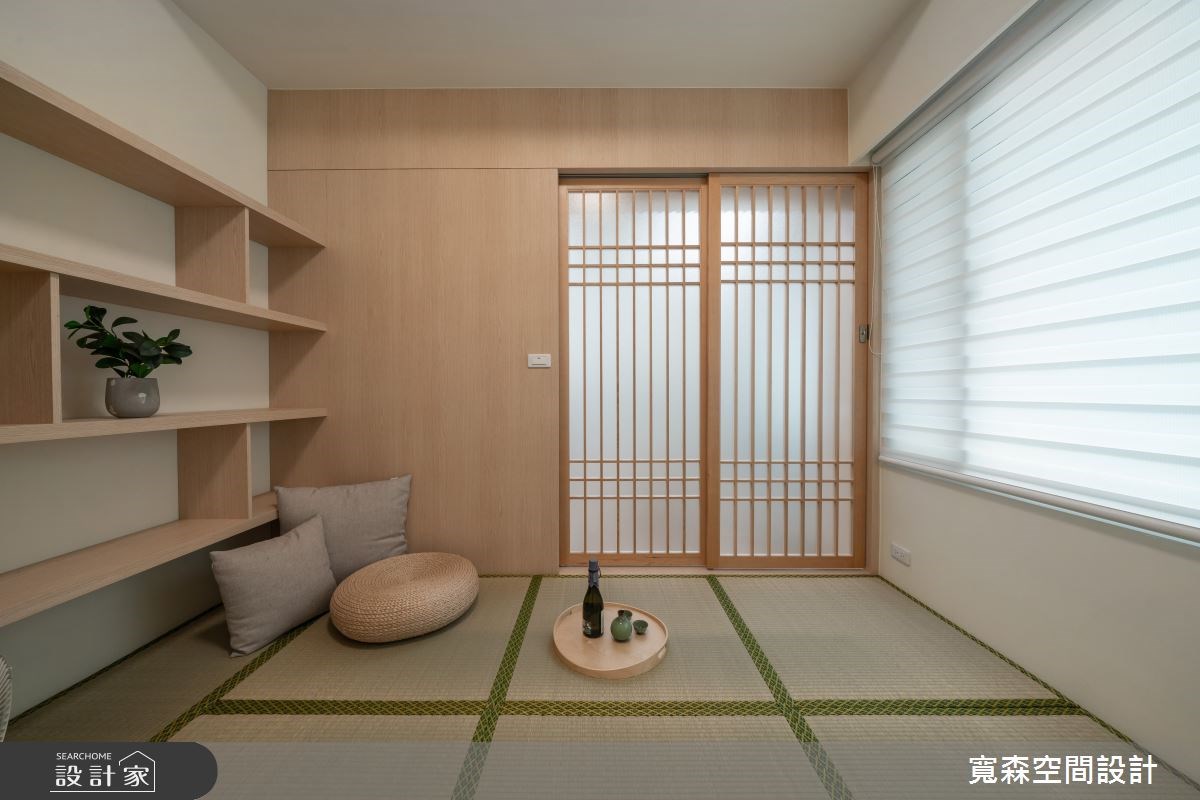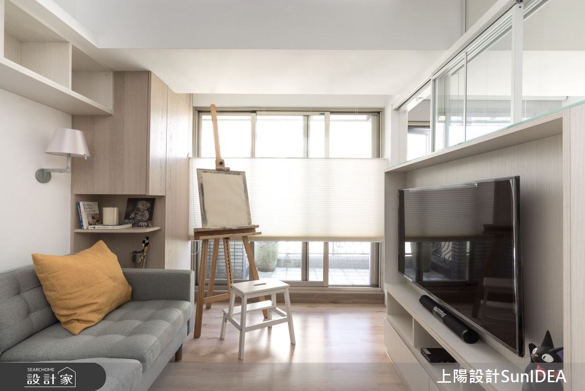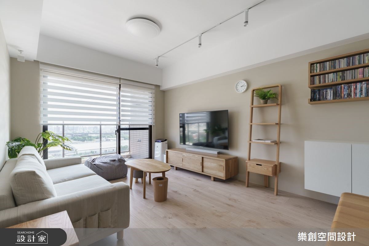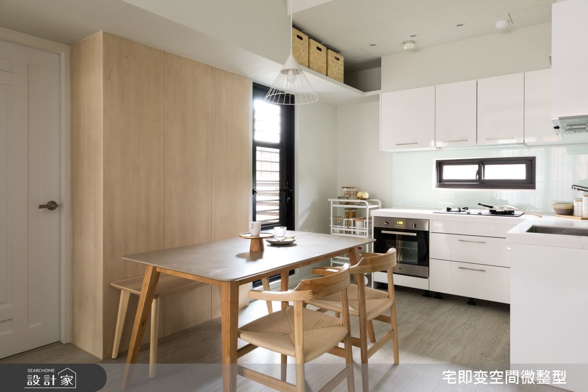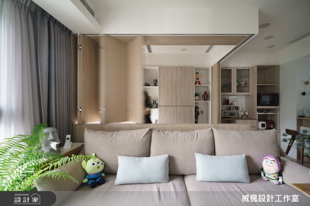 因為家中即將迎接新生兒的到來,所以 18 坪無印風小宅產生了老屋翻新、格局重整的需求。設計師在客廳旁依循大樑,用格柵拉門將空間一分為二,切割出獨立的工作區塊,而窗邊吧台刻意向外延伸,給予足夠的辦公檯面,並與開放式收納櫃接壤,讓畸零空間轉變為高機能的全新場域。