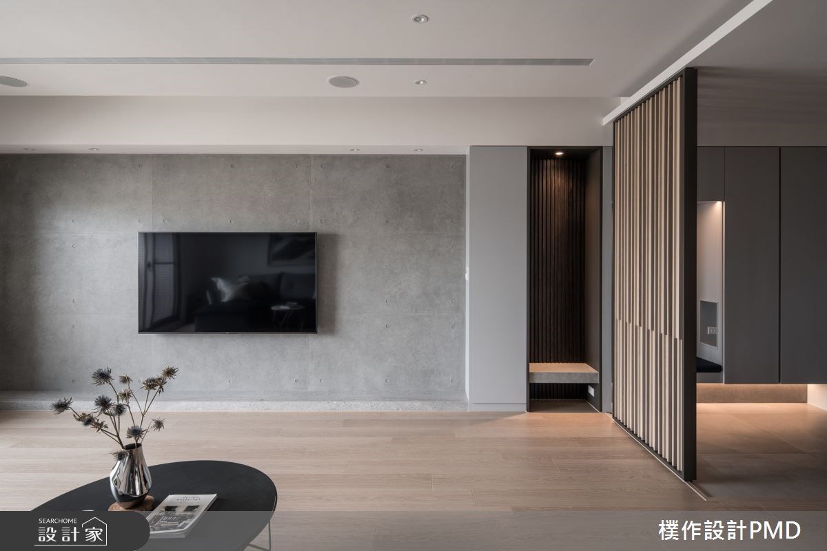 兩層樓加起來超過百坪的大宅,混合女主人喜歡的日式格柵與男主人愛好的清水模質感,透過漸層的格柵作為屏風造型,搭配客廳電視牆的清水模質感,碰撞出質樸又有變化的審美共識。臥室以半開放式的櫃體設計,分層收納衣物,而無把手的櫃門則貼心地照顧到生活安全,滿足居住者的日常所需。