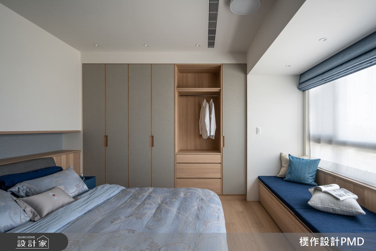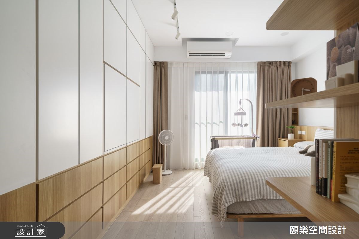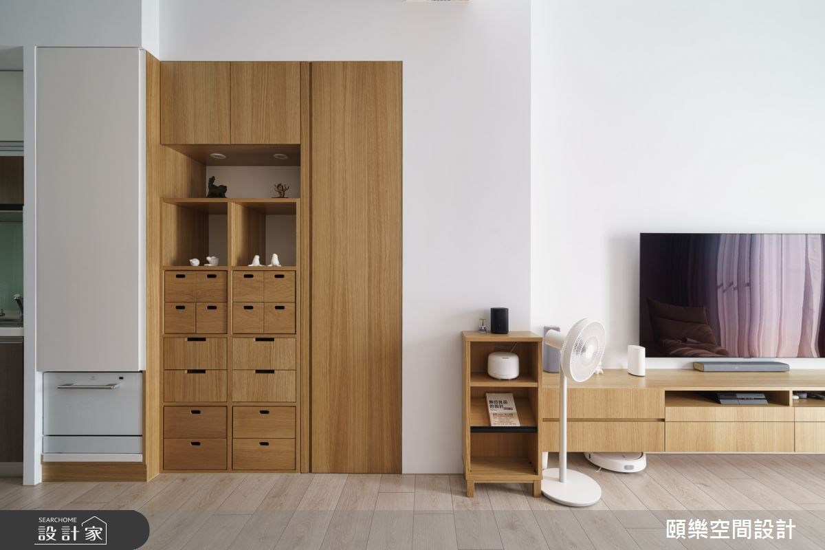 49 坪透天厝的屋主喜愛日本無印風的溫暖與智慧家電的便利,因此選擇小米智慧家電系統,只需要聲控就能夠開啟燈光、音樂及家電功能,同時簡約的白色家電設計完美融入木質調為主的居家空間,為一家三口量身訂製極簡生活。主臥收納櫃以 2:1 的純白與木色比例,減輕櫃體的沉重感,成功拉大空間視覺。