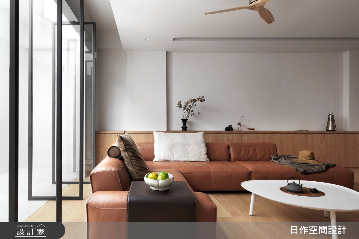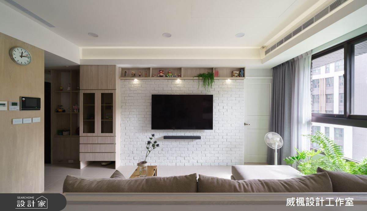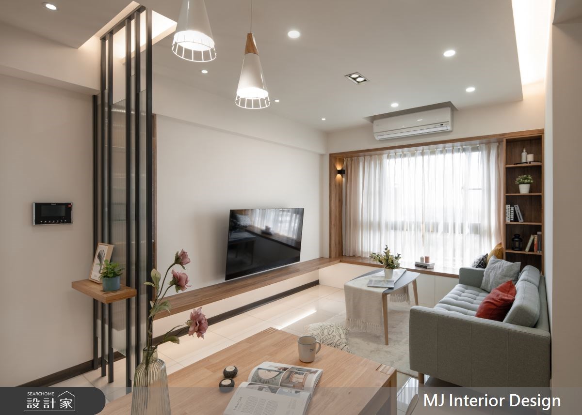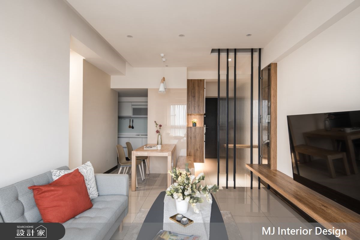 20 坪四口宅運用大面積的留白,搭配實用的木色收納櫃作為點綴,室內從玄關的鐵件玻璃混搭屏風開始,連接電視牆檯面到窗邊臥榻區,形成一氣呵成的木質感設計,而臥榻透過木框形式化解樑柱的尷尬,又能兼容右側的收納櫃,勾勒出一家人和樂融融的生活構圖。