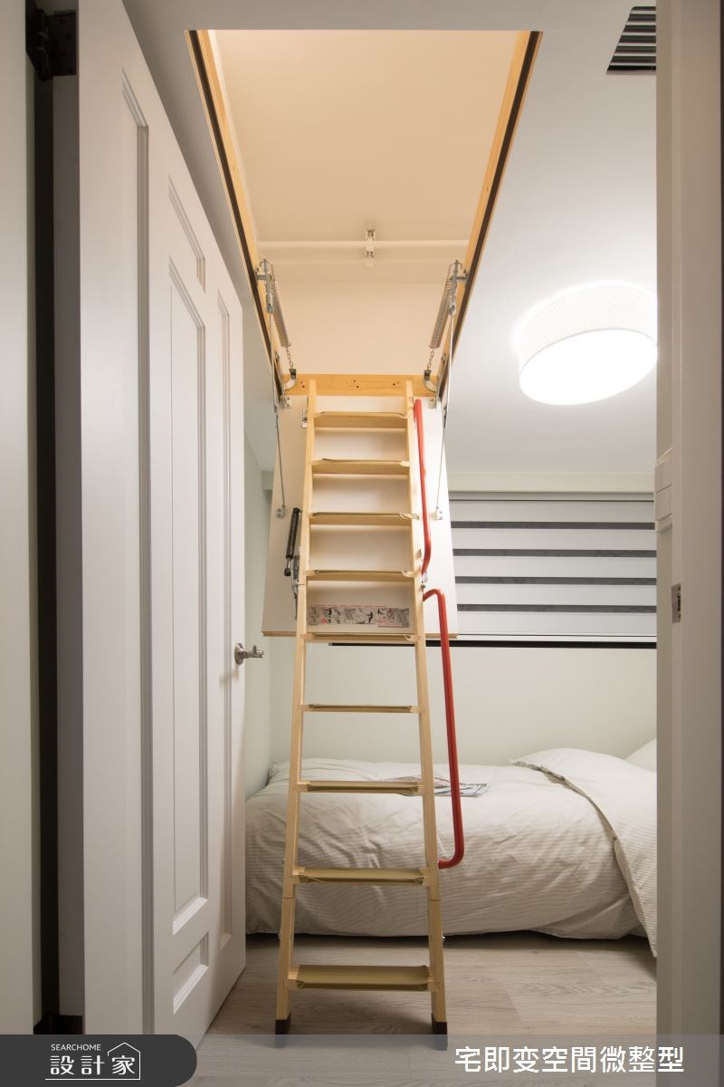 皆為教職的夫妻倆帶著孩子與貓咪,入住這間 21.4 坪的透天厝,首先在玄關就以洞洞板和一日衣櫃區,賦予充足的收納機能。接著客餐廳之間用旋轉式電視牆,作為空間的分野,同時翻轉出兩側的使用情境。而考量到父母偶爾會來拜訪,因此挑選質感高雅的障子門、榻榻米,擘劃出能供過夜歇息的多功能和室。