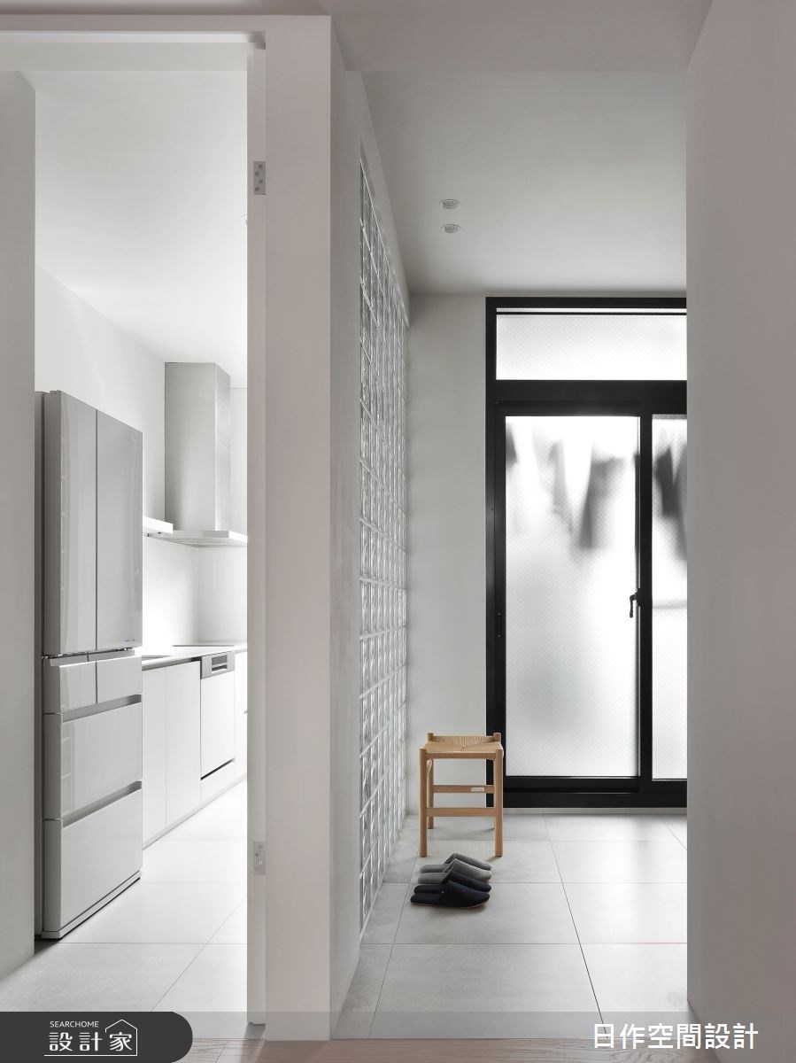三層樓透天厝屬於長型格局,加上建築周圍大樓林立,導致住宅採光不足,因而設計師運用夾鋼絲的霧面玻璃落地窗和玻璃磚隔間,讓玄關與廚房充滿日光圍繞。房子中央設置明亮的挑高天井,加上客廳的玻璃旋轉門,大幅提升無印風住宅的採光、通風效果,擁抱透亮無負擔的空間氣質。