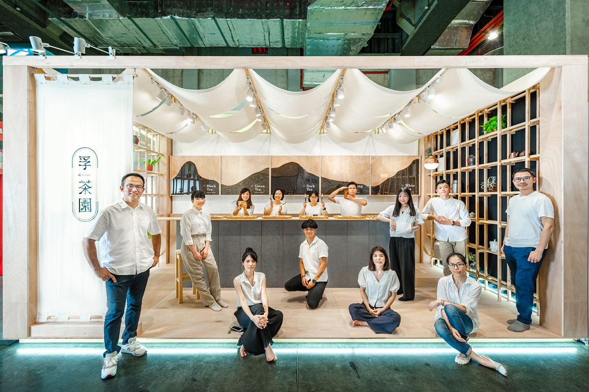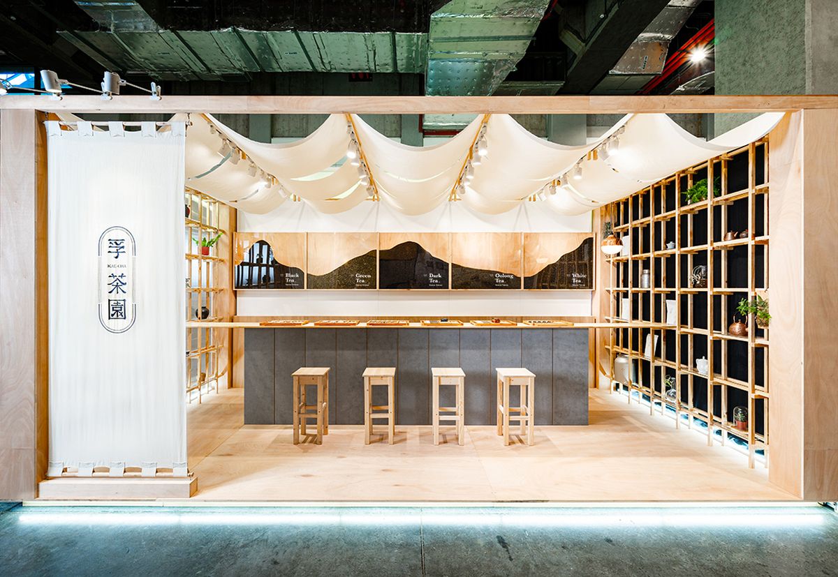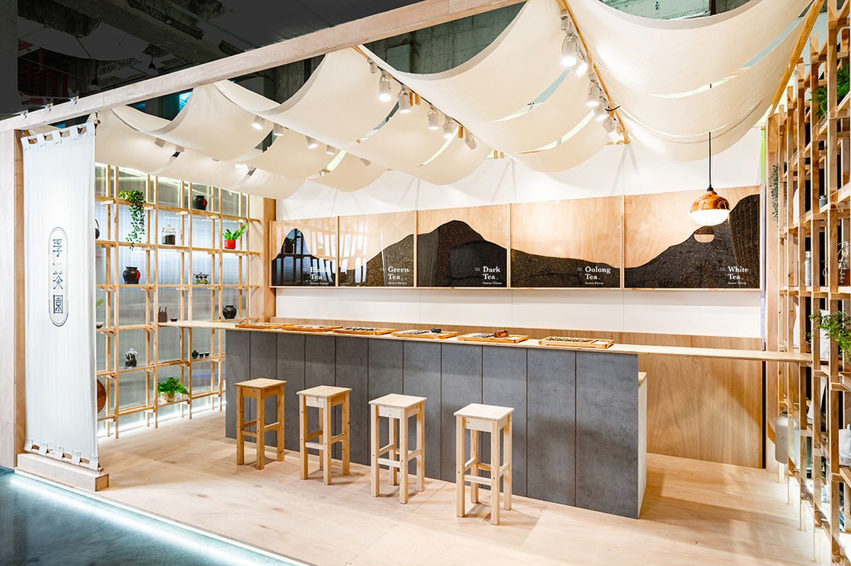 本次國際烘焙展中,一葉藍朵設計團隊攜手3+2 Design Studio操刀孚茶園展場設計。結合實木、水泥、土壤、綠植、棉麻等原生材料,通過組件形式將品牌核心的自然、樸實,孕育整座茶山的概念帶入展場空間,令每個到來的旅人皆能感受到孚茶園KAE CHA傳遞的純粹與美好。