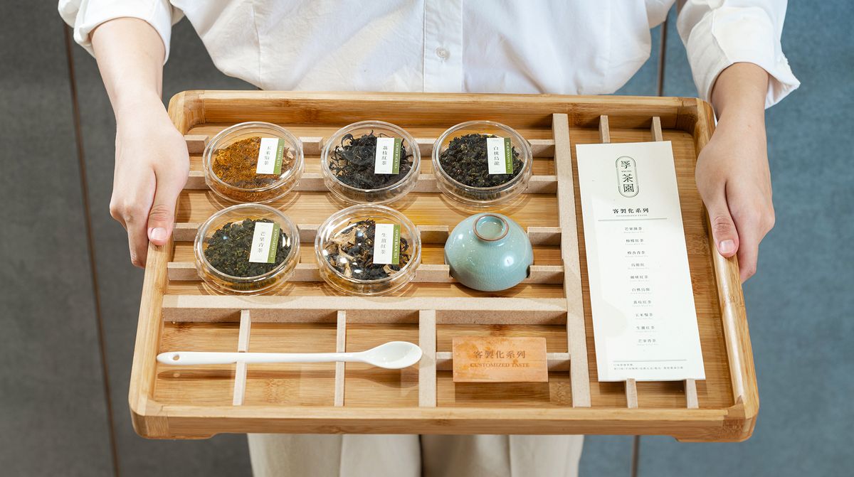 藉由各式茶粉、茶葉等原物料的展示,讓消費者能更近一步感受觸覺、視覺、嗅覺、與食飲的感官體驗。